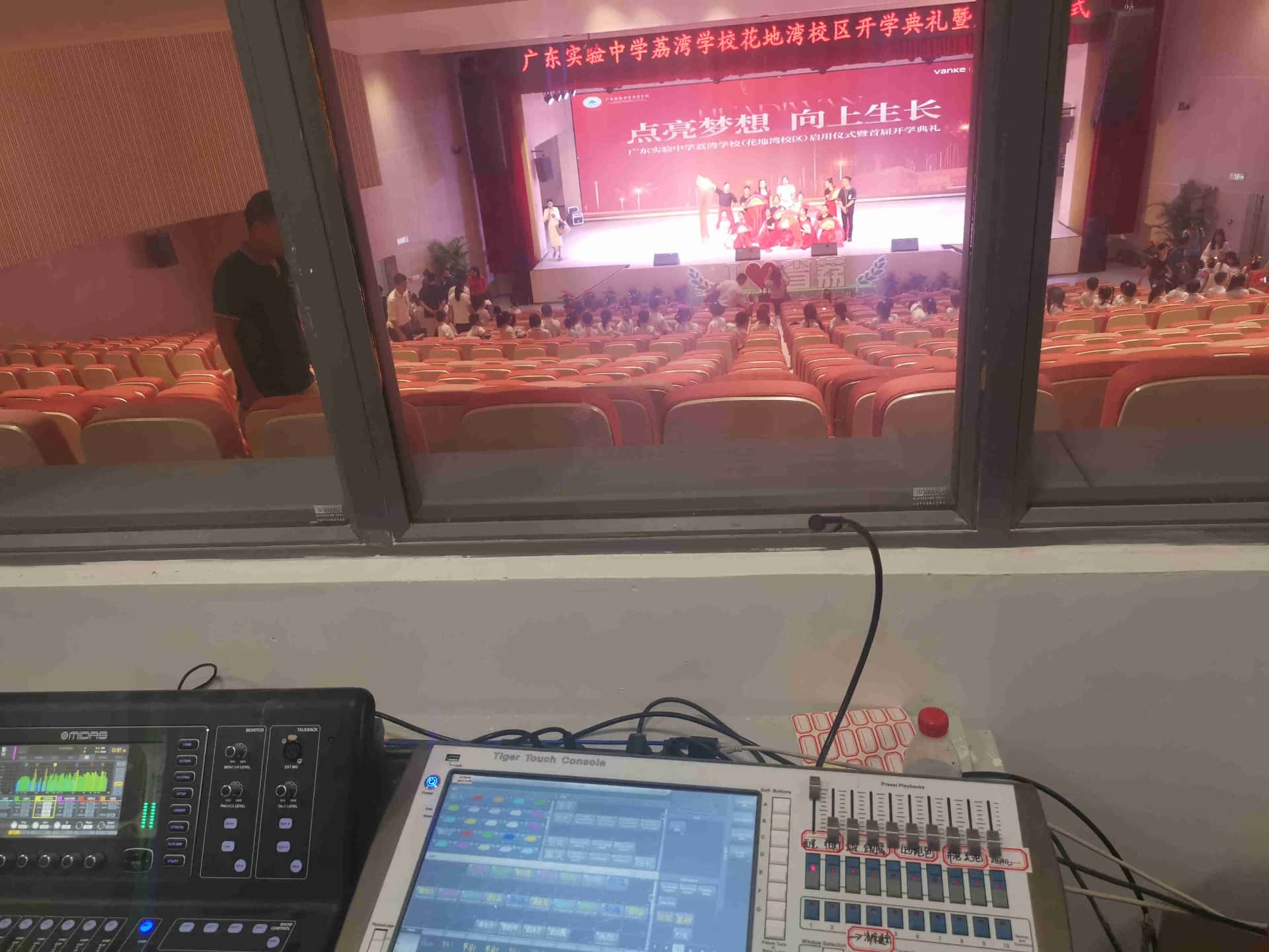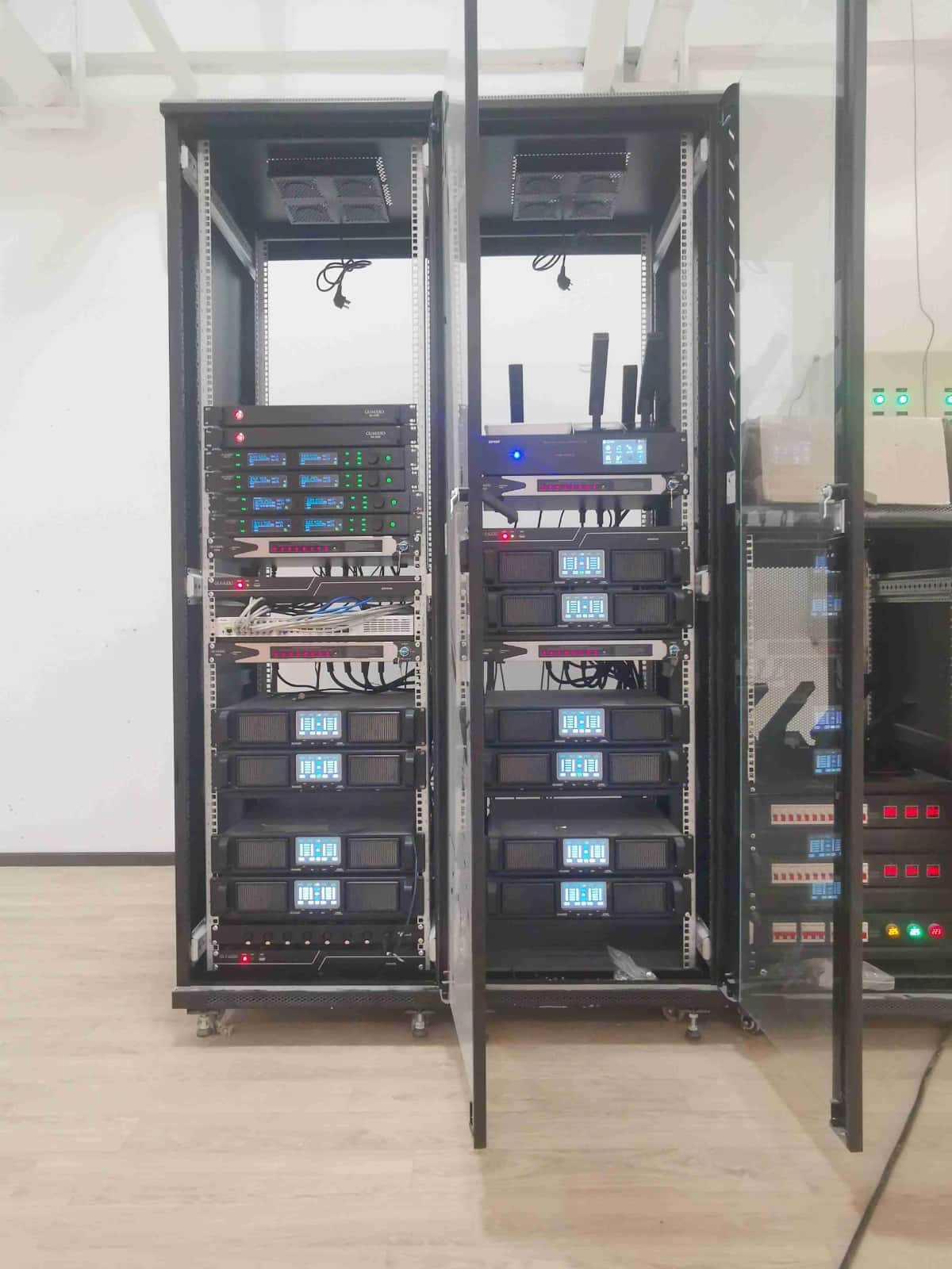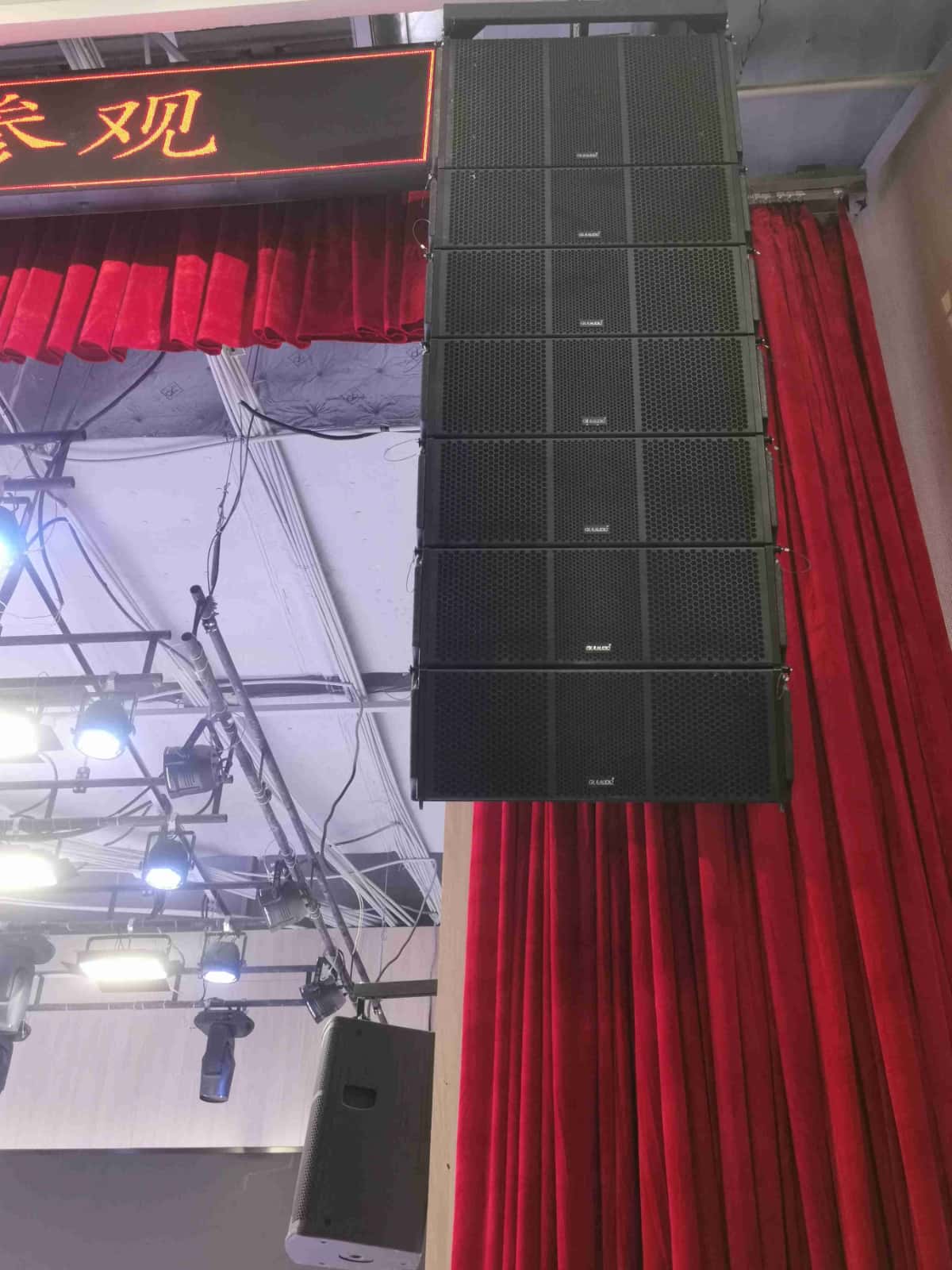 扩声系统:系统配置了12只单10寸线阵列扬声器;2只双15寸超低线阵列扬声器;2只8寸台唇全频扬声器;14只12寸辅助全频扬声器;2只15寸返送扬声器;2只单18寸超低频扬声器;全数字四通道功放10台;3台处理器,1台调音台系统处理