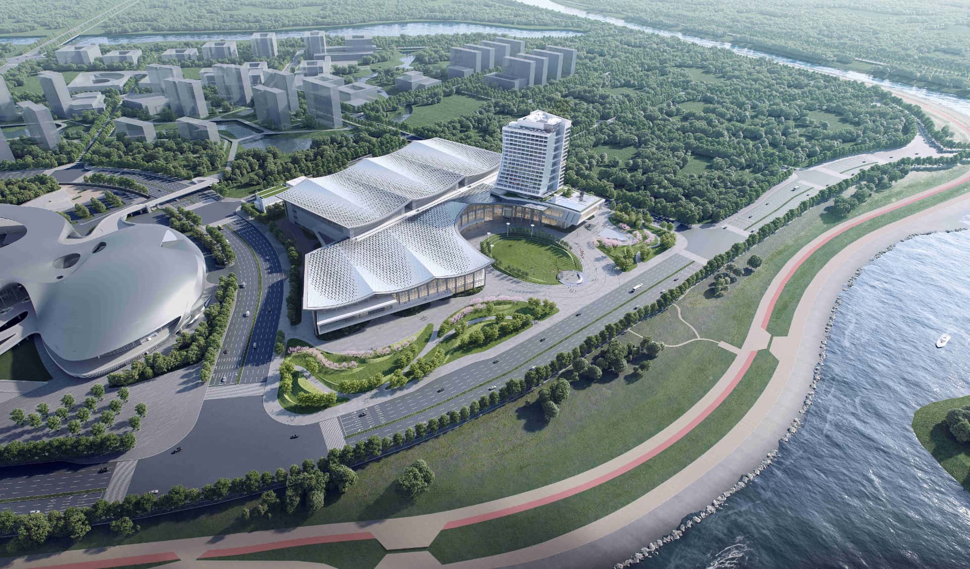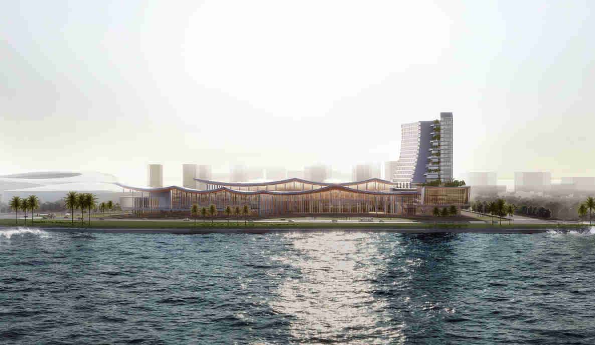 汕头市华侨经济文化产业孵化基地项目拟建于汕头市华侨经济文化合作试验区东海岸新城塔岗围片区北侧,南面与汕头大学体育中心相邻,西侧与汕头大学东校区相邻,东南侧为滨海景观大道东海岸大道,东北角为其配套酒店建设用地。因该项目用地位于重点片区,且一线临海,需与相邻的汕头大学体育中心设计格调相互协调,形成东海岸新城整体的滨海建筑形象和天际线,项目建成后将是展现汕头市城市形象的一个重要地标性建筑。