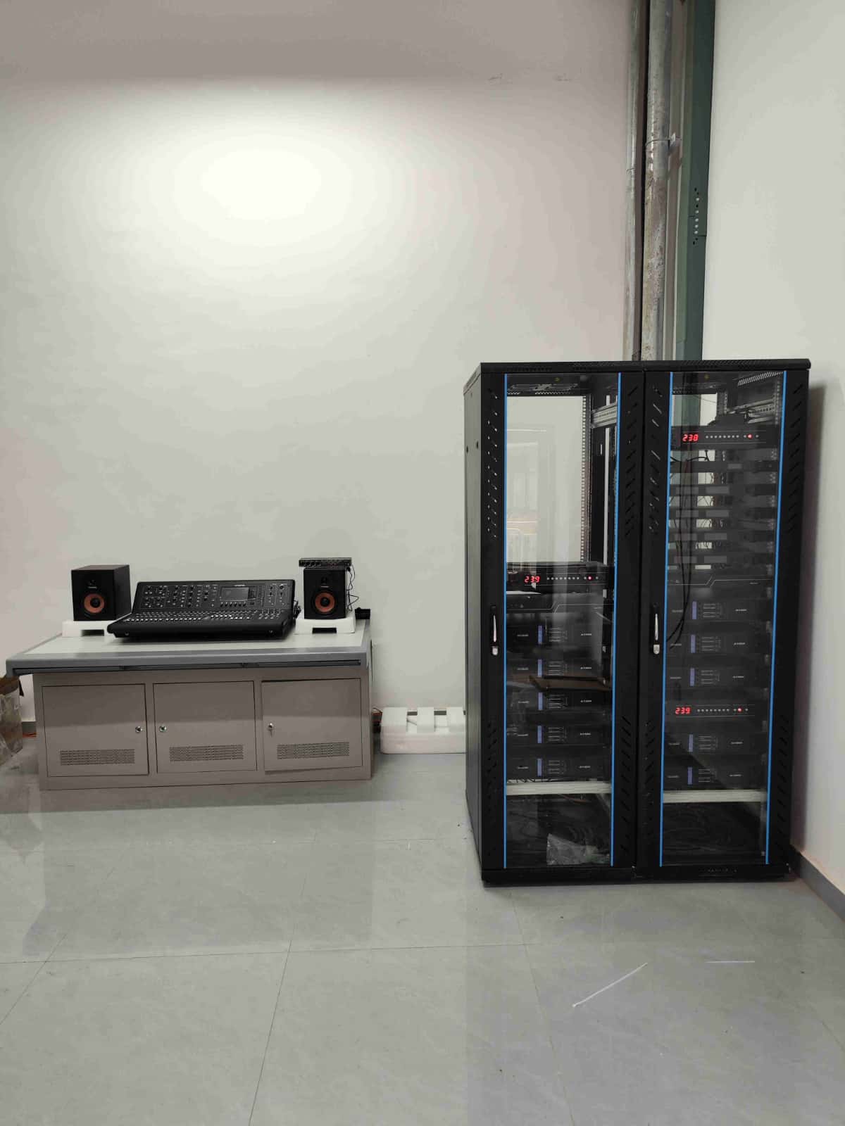 总建筑面积约4606.32平方米,为一座综合性的现代化多功能健身中心,选用品牌:广州鼓良GULAUDIO ,设计采用固定安装扩声系统、分散式扩声,配置如下:北侧观众扩声扬声器系统,4组,由8只双12寸两分频扬声器组成;南侧观众扩声扬声器系统,4组,由8只双12寸两分频扬声器组成;西侧观众扩声扬声器系统,2组,由4只双12寸两分频扬声器组成;东侧观众扩声扬声器系统,2组,由4只双12寸两分频扬声器组成;比赛场地的扩声扬声器组配置了有4组,由4只双12寸两分频扬声器组成。这样布置能够有效覆盖目标听音区,保证运动员在激烈的赛况中也能听到清晰的播报声音。控制系统则设置32路主扩声调音台,该调音台具有32个模拟输出3个AES3输出,2个AES3输入.